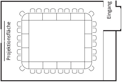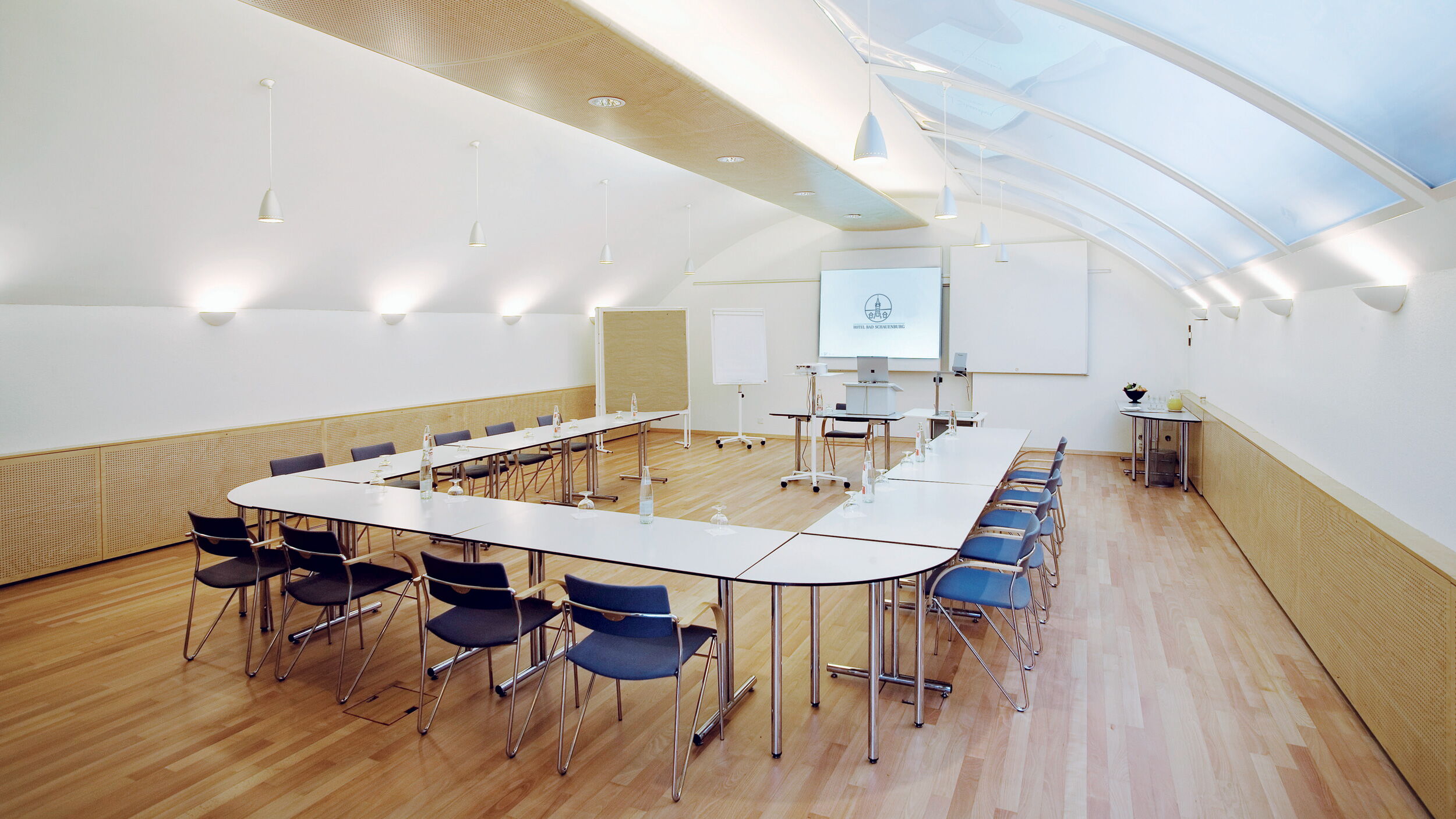 The Birssaal under the semicircular glass roof leaves nothing to be desired in infrastructure for a successful event. The large window offers a view of the Baroque garden.