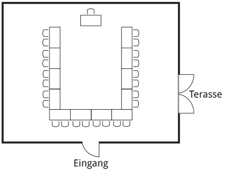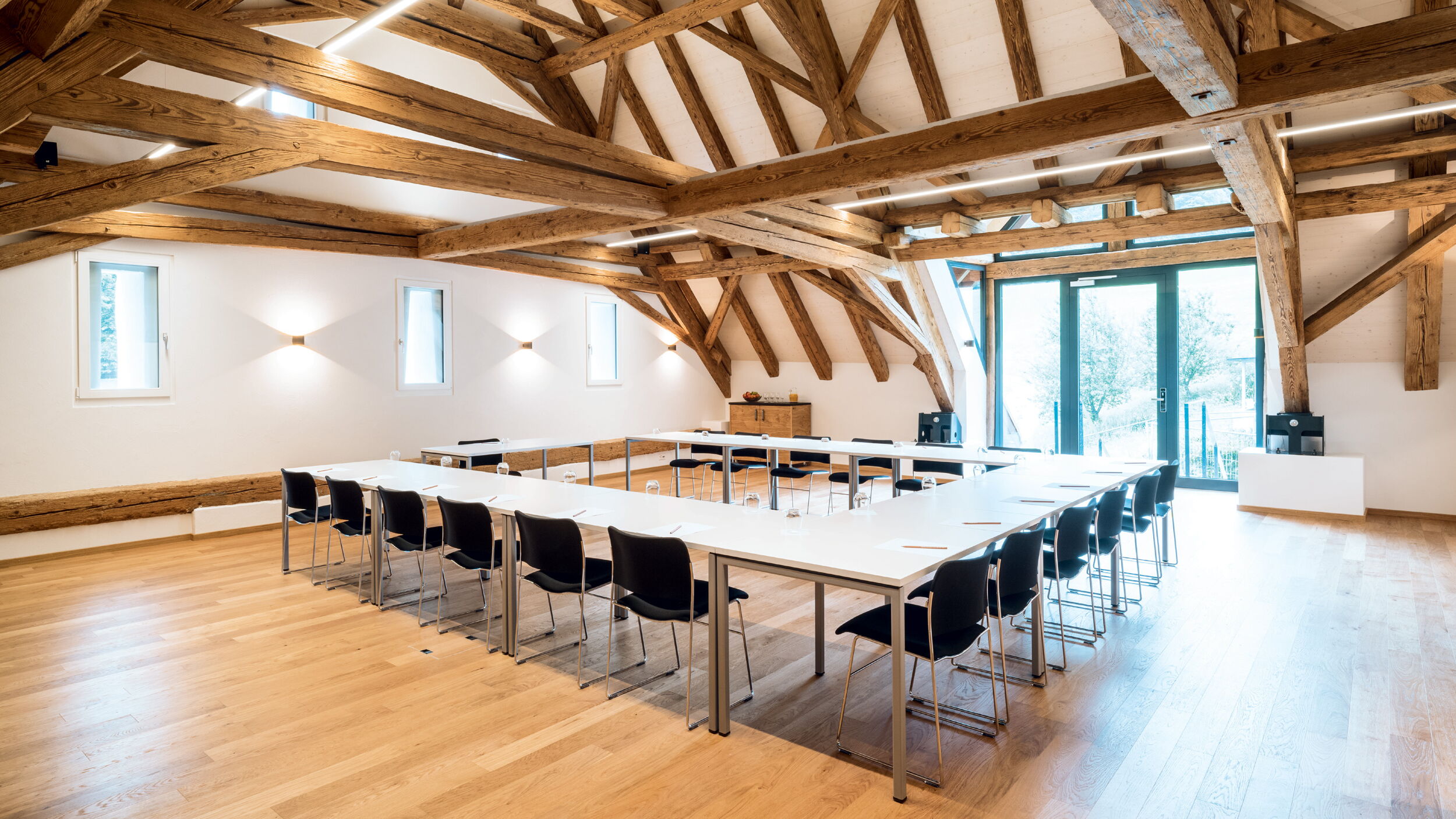The imposing hall is located in the attic and impresses with historic exposed beams and, simultaneously, a modern touch. For breaks there is direct access to the outdoor area.