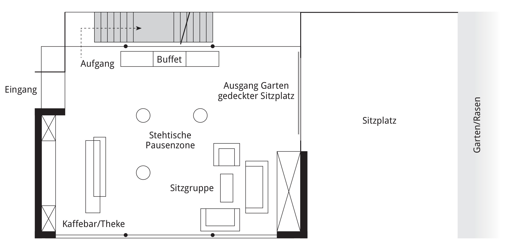 Ideal for casual group work or lunch buffets up to 15 people: The foyer on the ground floor with a cool lounge corner and direct access to the baroque garden. Break room for Birssaal, Röseren and Ergolz.
