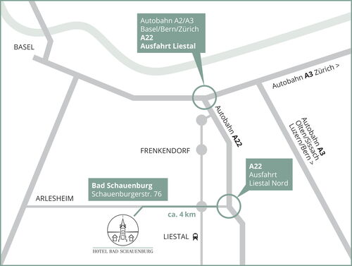 Bad Schauenburg is only 20 minutes by car from Basel. A few steps away from the hotel is the visitor parking lot with ample free parking. The parking lot is, of course, under video surveillance.
