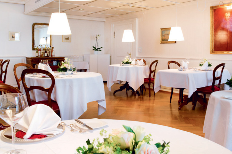 The room in Louis Philippe style provides the adequate setting for high culinary art and classy enjoyment: Silk wallpaper, white-laid tables and candlelight. New chairs increase the seating comfort. The extraordinary: In the Basler Stübli it's possible to dine on the sofa!