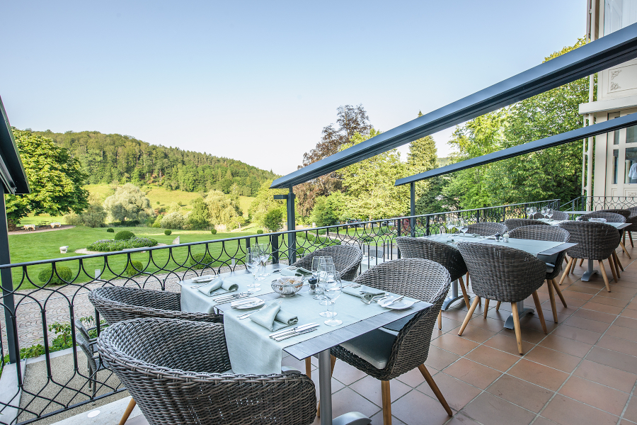 The veranda exudes grandeur and a touch of sophistication. It offers a breathtaking panoramic view over the park and the valley. In the stylish rattan chairs in Italian design, you can lean back comfortably and forget the world around you. An insider tip also for a family or company event around a finely laid table.